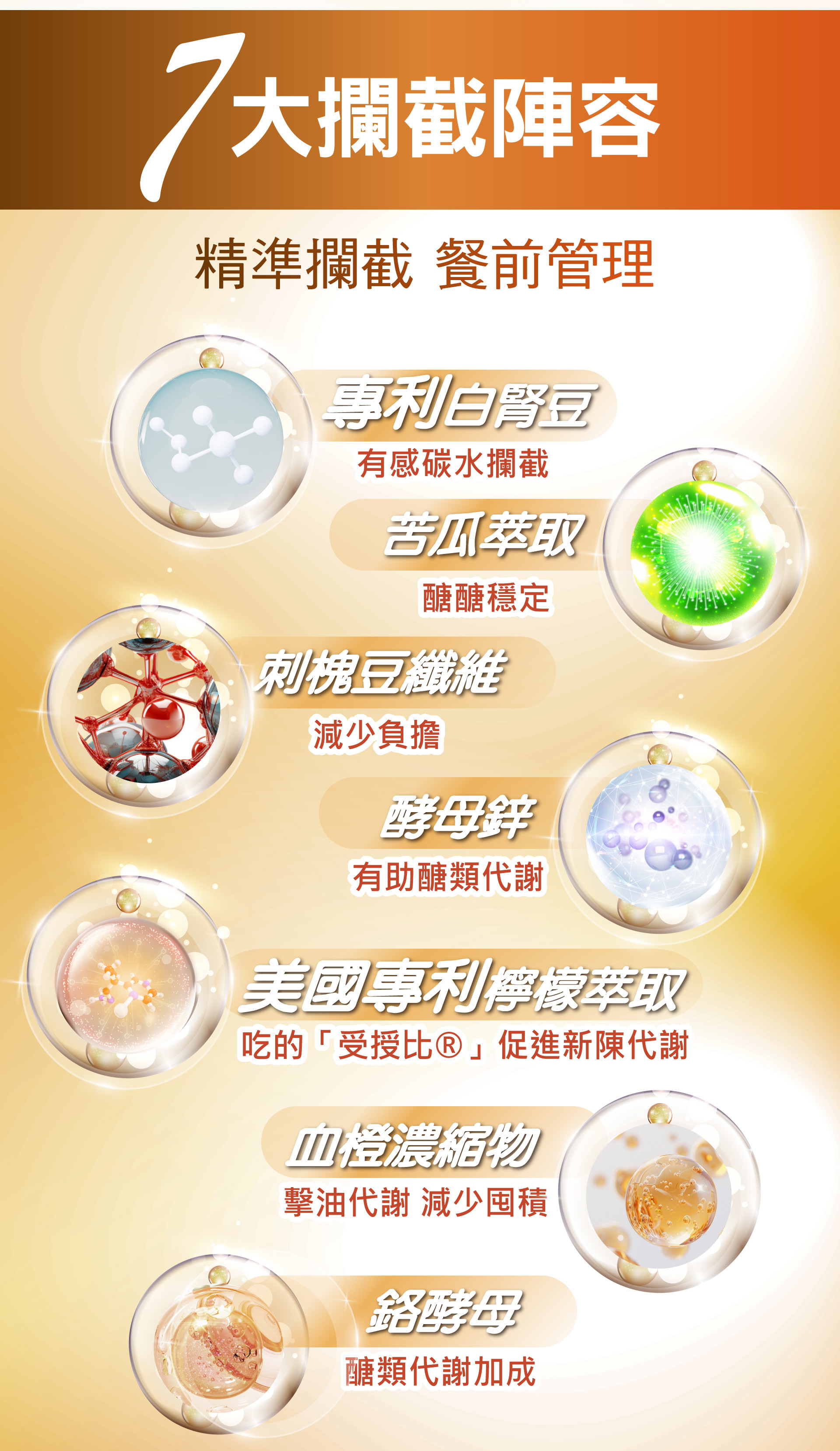 成 分:白腎豆抽出物(白腎豆抽出物、阿拉伯膠)、玉米來源可溶性纖維、島胡椒萃取粉(糊精、島胡椒萃取)、鋅酵母、鉻酵母、刺槐豆萃取物(刺槐豆萃取物、果寡糖、刺槐豆膠、二氧化矽)、檸檬萃取物、苦瓜萃取粉(山苦瓜、麥芽糊精)、血橙濃縮物(血橙濃縮物、麥芽糊精)。